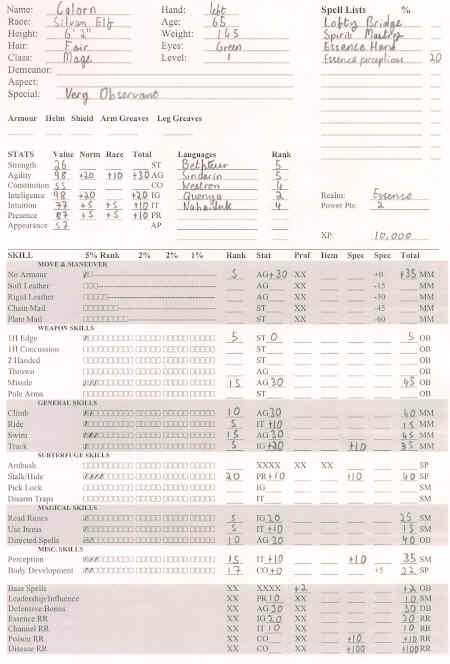 Calorn Silvan Elf Mage I was born in Lindon of Silvan parents. My father, Dorlas, and my mother, Arien, had moved to Lindon many years before. They had always meant to return to Greenwood but with the passing of time had never quite gotten around to setting out. With the collapse of Rhuadar and Cardolan and the rise of the enemy in the north the journey became more hazadorus. After my birth, they decided to remain in Lindon as it would be too dangerous to cross Eriador with a young child. They settled in a community on the foothills of Ered Luin. Hence I spent my youth climbing hills and trees and swimming in the Gulf of Luin. As I grew older I learnt archery from my father and lore from my mother. I also studied with Telperion, a Noldo Lore master. I was happy in Lindon, however as I grew to adulthood I developed a longing to travel to Greenwood. I wished to see the ancestral halls of my people. After eventually gaining the blessing of my parents I set out.