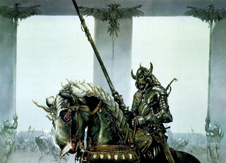 The party headed north along the river bank. The terrain was hard for the horses and they had to be led. Thorin was very confident that he would be able to lead the group to the castle without any problems. After two days travel the ford was reached and crossed. The party camped for the night on the northern bank. Howls could be heard to the north. The party secured the horses and lit two fires. As the night past the wolf howls got closer and closer. At about 4am Calorn decided that the wolves were too close and woke Tirel. On the ground Thorin came to the same conclusion and woke the others while arming himself. To the east of the camp was the largest collection of the animals. Thorin, Bors and Bravd lined up facing the main body of wolves. Elonil positioned herself on the far side of the horses watching to ensure that no attack was forthcoming from that direction. In the tree above the camp Tireal readied his bow and Calorn started to prepare a spell. A large wolf started to approach the camp. It stepped into the fire light where it paused preparing to attack. The wolves behind it were barking and snarling to encourage it forward. Calorn cast his prepared sleep spell at the animal. To his delight the spell worked and the wolf collapsed. The party members on the ground considered moving forward to kill the animal but stopped when they realised that they would probably be mobbed by the other wolves. Tireal shot at slumbering wolf but missed terribly. After pausing to reload he fired again this time striking the wolf in the side. The minor injury woke the wolf, it arose staggering slightly. It started to advance towards the party. Two other wolves joined it's advance coming in on opposite flanks. Calorn managed to knock out one of the flanking wolves while Tireal shot the other through its front leg. The injured wolf limped away from the battle. It was clear that the wolves were about to rush the party. Calorn tried to quickly rush off a spell to knock out the main wolf but he failed. The animal charged the party followed immidiately by another two wolves. The first few seconds of melee were surprisingly non-lethal. Neither Man, Dwarf or Wolf succeeded in injurying their opponent. Also Elven missile fire from above was off target. Combat soon started to heat up. The Wolves inflicted the first strikes. Bravd was bitten in the leg. He started to bleed slightly, however his grieves had deflected most of the damage. Thorin also took some damage. Again the warriors failed to damage their opponents. Calorn tried to knock out the main wolf. It was attacking Thorin, once again he failed to pacify the enraged animal. Bors took a bite to his thigh and also started to bleed slightly. Bravd fell back slightly after fumbling his attack. Finally one of the warriors got their attack together, Thorin managed to strike the wolf in front of him in the side. Almost frogotten and alone at the back of the camp Elonil stood facing another group of wolves. These animals lacked a leader, but faced with only one opponent were starting to advance. Elonil decided fire would be the best way to scare them off. She started to fling flaming brands in the direction of the wolves. This approach was very successful. The animals fell back and ceased to advance. The continued to prowl on the edge of the darkness, hiding in the shadows. Calorn feeling almost drained of magical power reached for his bow and quiver. Tireal in a fine display of archery shot the wolf in front of Bravd through the neck, severing nerves and blood vessels. The animal collapsed suffering from heart failure. Thorin and Bravd both missed the remaining wolves. Calorn firing his bow for the first time in anger shot the main wolf in front of Thorin for decent damage. Bravd got bitten in the chest but in return hit the wolf squarely in the chest. The main wolf fled followed a few seconds later by the other. The party spent the next two hours shout and throwing fire-brands at the wolves to ensure that they did not re-attack. Bors and Bravd's wounds were also bandaged. Then after 3 hours sleep the party arose to head north once more. The party rode north for four hours. They made good speed in the light woods and arrived in the early afternoon. They left stopped in the woods were they had found the baggage of the last party. Elonil and Tireal made ready to go scout out the castle. At the last minute Calorn decided to join them. The three of them snuck quitely to the edge of the treeline, to get an initial view of the castle. The place had changed much over the Winter months. A new door had been placed built and the walls looked in better shape. Tireal also noticed recent tracks of about 8 humans mingled with orc tracks. The tracks led to and from the castle. He also spotted what looked to be an archer in a tower through the arrow slit. Calorn headed back to the others with s information. Calorn, Bors and thr Dwarved dicussed the implications of the Orc and Human tracks for a while. Eventually Tireal and Elonil returned. Elonil was soaking wet. She had crawled up the stream leading into the castle. The stream's entrance to courtyard had been blocked with a number of rusty two-handed swords. She seemed keen to back. She reckoned that with one strong person along she would be able to remove one sword and repostion another. The resulting gap would allow her to get inside. This plan was deemed too risky by the others. Instead Tireal and Elonil were sent to scout out the land to the north of the castle. They returned after an hour or so. They had seen no significant tracks leading away for the castle. It was decided that Lord Fardwith with 7 supporters had taken up residence in the castle in colusion with the Orcs. This information had to be brought back to Minas Brethil so the party set out south. They hoped to be on the far side of the ford by nightfall. The river would probably prevent wolf attacks. After about an hour of riding south Tireal and Bors suddenly 