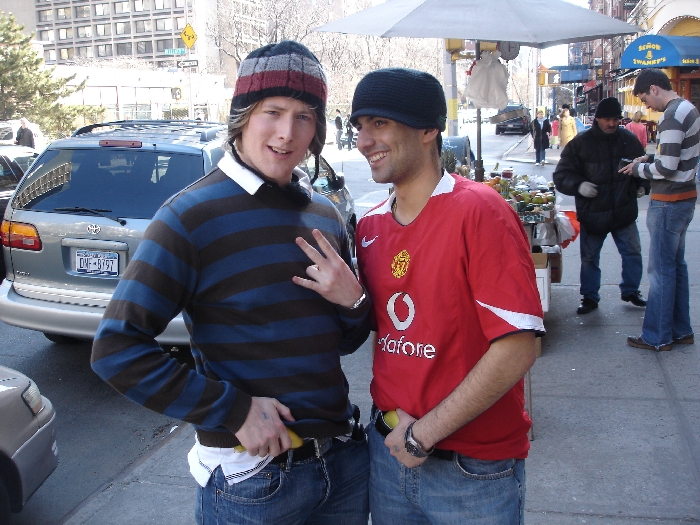 Foreground: Anto & Neeps pose with Banana's in their pants. Background: George buys a pear