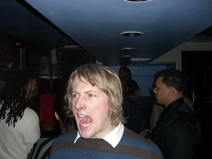 Into some nightclub, to boogey boogey. Below: Someone has told Anto the hair drier broke