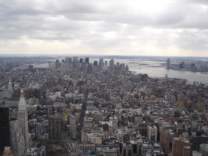 Manhattan view towards Downtown - visible in the bay is the Statue of Liberty