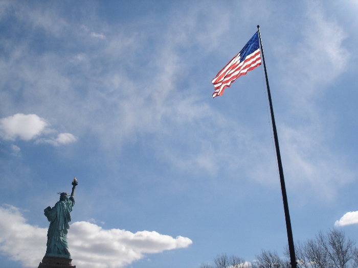 U-S-A! The Stars and Bars flying close to the Statue of Liberty