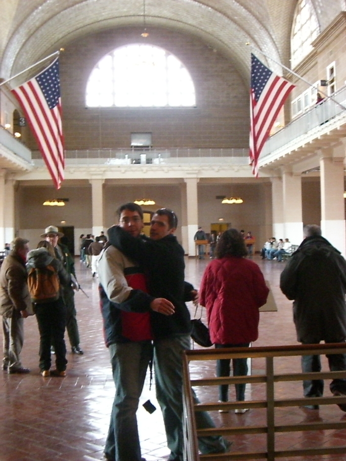 Millions passed through this hall as they started a life in America. Geo and Olly hug in appreciation
