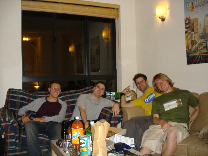 Chilling out with beer and pizza in marks apartment. Tim from Fiji has joined us at this stage :)