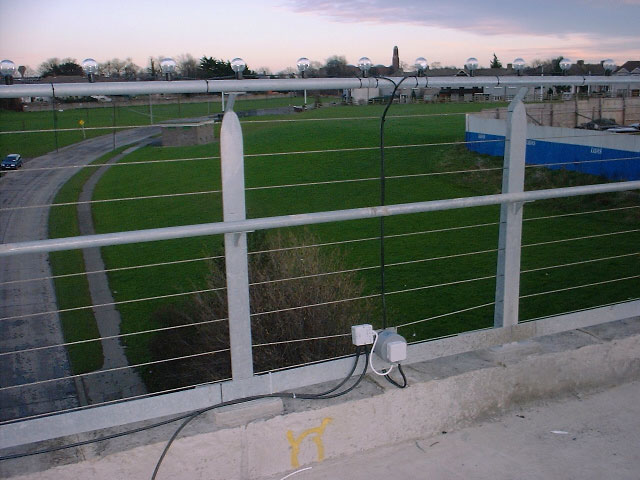 They strung lights along the railings of the bridge, it looks quite well at night. Here's some of the electrical assembly for the lights, with the luas hoardings in the background.