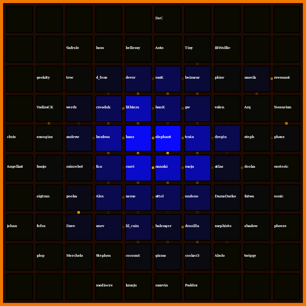 | 11 | |                                                 | | | | | bloke, sortof, howiya, physio, id3 | | elements, pointers, starcraft, mp3s, o_o, glory | | tags, urgh, bright, nexus, attacks, assembly | | speed, gym, deadly |