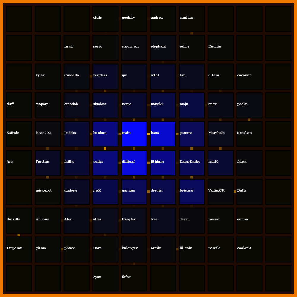 | 13 | |                                                 | | | | | nub, unce, wogan, facist, failtab, jpg | | mebbe, korea, ps3, musical, blizzcon, nm, sc2 | | anyways, eugh, rant, diaf, gmail, weechat, rly |