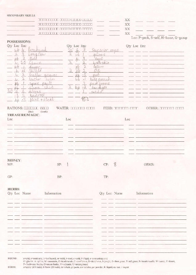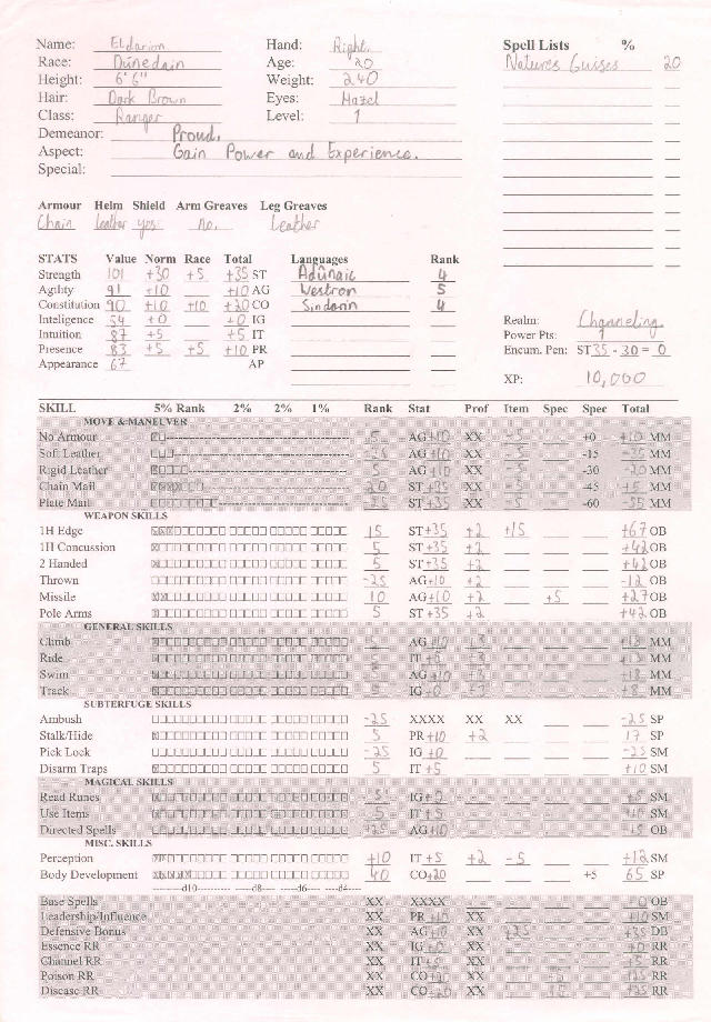 Eldarion son of Amandil son of Anardil Older Brother Hallacar Younger Sister Elantar Mother Isendie I grew up in the East of Arthedain. My family were descended from the nobility of Cardolan. They had relocated to Arthedain about two hundred years ago as the kingdom disolved. Being of pure Dunedain blood ment my family were made welcome in Arthedain, however some of the bitterness of past feuds and rivalry still simmers below the surface of everyday life. Second son of a minor lord, My brother Hallacar made it clear from a young age that I was the spare and unnecessary son. Hence I tried to spend as much time out of the manorhouse as possible. Barahir was the forest keeper on our estate. He taught me the basics of tracking and survival in the wilds, from my father I received a more traditional education and combat skills. My life changed significantly after the death of my father, Anardil. He was killed while I was visiting my uncle further to the west. He had journyed east to visit the lands of my old Grandfather's estate in Cardolan. My elder brother Hallacar led the war party that found and exterminated the guilty raiders. The fact that I was not part of the party was highlighted and many claims of cowardice were made against me. Also with my brother Hallacar assuming Lordship of our house, my place there became less welcome. I decided that it was time for me to go out and prove myself in the world. A few years adventuring in the wild should be enough to silence any claims that I am weak and a coward. So I gathered together some kit, and taking the sword of my grandfather, a sister sword to that of my father now carried by Hallacar, I headed East. Bled to death after being hit by a crossbow bolt. Read about it